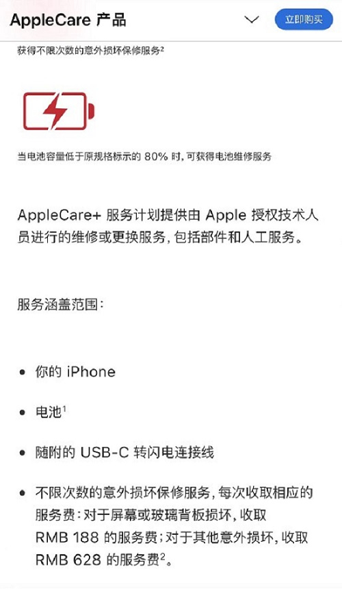 AppleCare+是Apple官方的售后保修服务,为消费者提供由Apple认证的服务和支持、优先获得技术支持、不限次数的意外损坏维修服务、电池维修服务,让消费者在后续使用中遇到问题可以得到快捷、实惠的手机售后服务。其中,针对不限次数的意外损坏维修服务,对于屏幕或玻璃背板损坏将收取188元的服务费,对于其他意外损坏会收取628元的服务费。相较动辄上千元的官方维修费用,很多消费者都会选择额外购买AppleCare+服务。