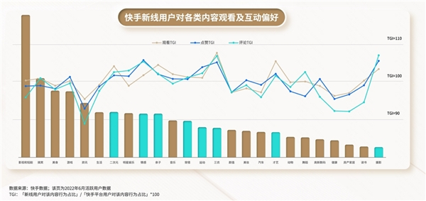 作为短视频赛道的典型应用、在新线人群中有着高渗透率且新线用户规模保持高增长的快手,成为品牌加速渗透并深度挖掘新线市场的重要渠道。而快手新线用户所展现出的强粘性和高潜力两大优势也为品牌增长提供更多驱动力。在内容消费上,快手新线用户更享受在平台社交,其互关率、点赞量增速、评论量增速、分享量增速明显高于高线用户,他们偏爱三农、家庭时光、才艺、摄影等内容。