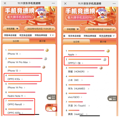 今年的双十一活动已经在10月24号开始,要说每年双十一剁手的最大头,除了美妆,另外一个就是数码产品了。根据京东手机竞速榜的反馈,目前用户热选品牌排名中,苹果和OPPO手机稳居双十一活动开启后的前两位。
