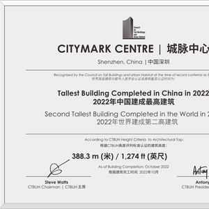 2022年10月26日,CTBUH2022全球大会于深圳城脉中心开幕。大会上,CTBUH正式认证城脉中心为“2022年中国建成最高建筑”“2022年世界建成第二高建筑”,并在全场嘉宾的见证下举办了揭牌仪式。