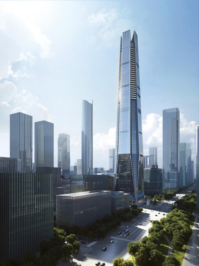 作为全球TOP级超高层,城脉中心汇聚了全球TOP级大师团队。其中,建筑设计由享誉全球的超高层缔造者KPF执笔。设计总监Josh Chaiken以致敬深圳精神为出发点,为建筑赋予了极具标志性的刚硬棱角和直冲云霄的进取姿态。