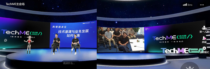 与此同时,本次大会还实现了深圳与广州两个异地分会场的实时互动:观众能在虚拟会场中通过大屏幕看到广州分会场的嘉宾,而在深圳XR绿幕摄影棚的嘉宾则会出现在屏幕前的舞台上。为了规避延迟问题,会场通过对齐GOP等技术处理,将时延差缩小到了1-3秒,确保两地嘉宾顺畅交流,成功开启一场“同空间、跨次元”的交流盛会。