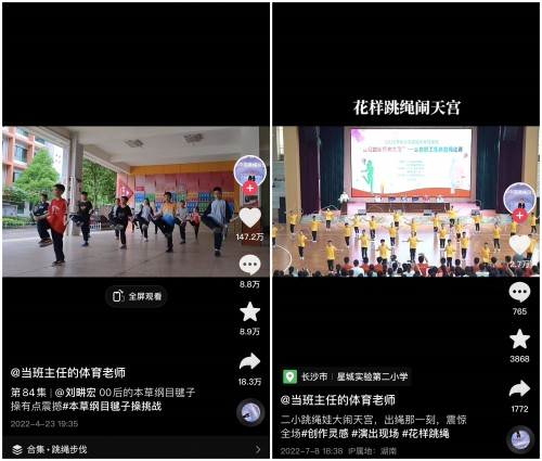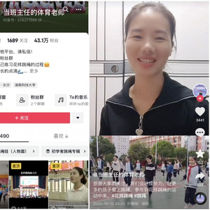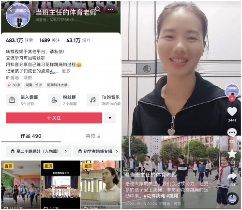 伴着极富动感的旋律,孩子们挥舞起手中的绳子,以令人眼花缭乱又整齐划一的步伐完成了一曲花样跳绳版的《本草纲目》。在赖玉蓉的抖音账号@当班主任的体育老师 中,类似的短视频还有很多。她除了分享学生们跳绳的内容外,还会教授各种花样跳绳的分解动作,让更多人对这一运动产生兴趣。通过一系列“硬核跳绳”短视频,赖玉蓉不仅打破了网友们对体育老师的刻板印象,也让大家看到了体育的另一种可能。