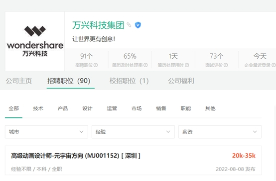 为发力元宇宙赛道,作为创意软件公司的万兴科技,一直在招揽3D设计方面的元宇宙专业人才。 如其发布的元宇宙方向高级动画设计师岗位,需要应聘者了解掌握三维动态视觉设计技能,并能够使用主流三维设计工具。这也是市场上对大多数元宇宙设计师的技能要求。
