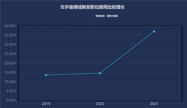 集中涌入的资金与雨后春笋般出现的元宇宙公司,催生了对相关专业人才的大量需求。报告显示,2019年至2021年,元宇宙领域新发职位数持续增长,其中2019年、2020 年分别较上年增幅为13.59%、14.60%,而2021年更是实现了37.07%的大幅增长。据另一报告显示,2022年1-7月,全平台元宇宙相关招聘职位数同比增长16.6%。