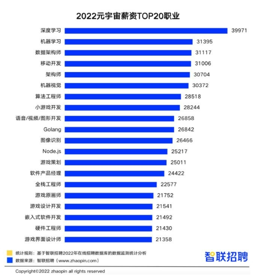 智联招聘近日发布的《2022元宇宙行业人才发展报告》中则表示,今年1-7月,全平台元宇宙相关岗位的平均月薪达到18515元,其中,VR/AR、元宇宙社交、游戏、虚拟人、数藏平台是五大对元宇宙相关人才需求最旺盛的细分领域。值得一提的是,在所有相关岗位中,深度学习岗位的平均薪资位居榜首,每月39971元。
