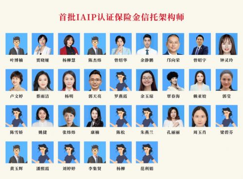 IAIP认证保险金信托架构师(二级)资格,全国首批获得者名单有:叶博楠、贾晓娅、杨柳慧、陈杰炜、曾绍华、余静鹏、邝向荣、曾昭宇、钟灵玲、卢文婷、蔡雨洁、杨明、郭天亮、罗燕霞、余玉琼、覃春海、赖亚姣、郭莹、陈雪娇、姚捷、张炜炜、康楠、陈松、朱燕兰、孔丽丽、周玉肖、梁碧芬、黄玉辉、潘熙霞、刘婷婷、李集贤、杨柳、范利娟等。