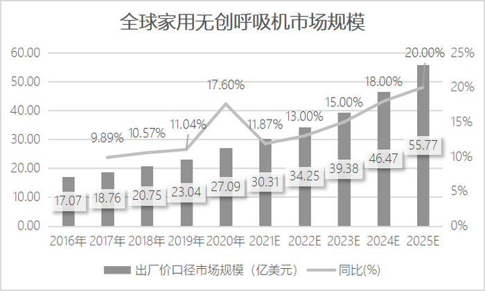 而具体至怡和嘉业核心产品赛道,据沙利文测算,家用无创呼吸机全球市场规模到2025年将增长至55.8亿美元,五年内年均复合增速达15.5%,同期通气面罩市场规模将增长至29.0亿美元,年均复合增速12.4%。据世卫组织预计,慢阻肺将在2030年成为全世界第三位主要死因。而无创呼吸机作为慢阻肺外科治疗、康复治疗、终末期护理等非药物治疗手段的首选方案,在老龄化、吸烟、空气污染等因素的推动下,市场或将持续加速增长。与此同时,因肥胖人群不断增多及老龄化加剧,睡眠呼吸暂停综合征患病率在全球范围内逐年提升已成为一个重要的公共卫生问题,对睡眠呼吸机的需求也正稳步提升。