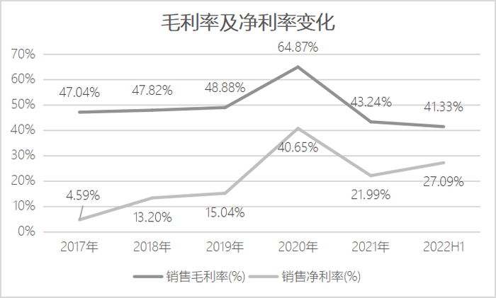2021年,怡和嘉业紧抓海外竞争对手召回事件的机遇,积极扩大销售规模,抢占海外市场份额,短期影响了毛利率表现,但2021年怡和嘉业境外营收同比增长83.02%,市场拓展成效显著。与此同时,2017年至今怡和嘉业销售净利率除2020年外整体呈现持续上升态势,规模效应日渐凸显,期间费用率持续下降,减费增效成果显著,2022年上半年销售净利率已上升至27.09%。