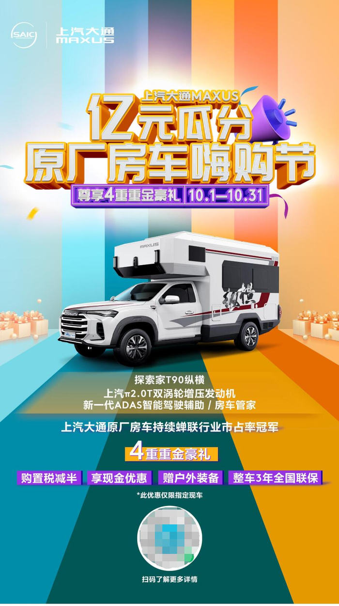 不得不说,房车旅游确实给大家的生活增添了很多乐趣。当然,要想安全舒适地出行,也别忘了选择像上汽大通MAXUS探索家T90纵横这样的优质房车。而且,因为上汽集团豪掷亿元补贴,让房车走入中国家庭,现在购买上汽大通MAXUS这辆新款房车,还可以尊享4重重金豪礼优惠:购置税减半、现金优惠、户外装备赠送、整车3年全国联保,大大节约了购车成本。当然,上汽大通MAXUS房车车型齐全、价格跨度大,从19.98W至72W元,同时B型C型各类布局均可选择。感兴趣的用户也可以关注微信公众号“上汽大通MAXUS房车”来获取原厂房车一手资讯,另外也可搜索“上汽大通原厂房车”微信小程序,让看车、购车、玩车一键达成!