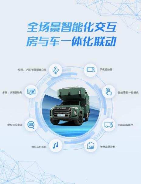 房车管家则是提升旅程舒适度的“利器”,它包括智能语音与远程控制。智能语音方面,上汽大通MAXUS新款房车探索家T90纵横在卡座区设置了独立的12.8吋触控屏,只需唤一声“你好,小迈”,就能够随时随地控制空调、遮阳帘、灯光、音乐等的开关,让出行更加的便捷。远程控制指的是通过手机APP,可远程操控房车进行相关操作,例如解锁或上锁车门、开启或关闭驾驶室车窗、启动空调和驻车燃油加热器等。同时,用户还能远程查看电池电量、清水箱与灰水箱水量、里程数、胎压、油量等,让所有信息尽在掌握。