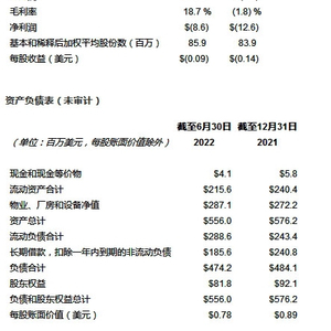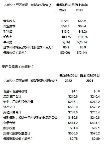 2022年上半年,归属于公司所有者净利润为-800万美元,基本每股收益和稀释每股收益均为-0.09美元。2021年同期归属于公司所有者净利润为-1,200万美元,基本每股收益和稀释每股收益均为-0.14美元。