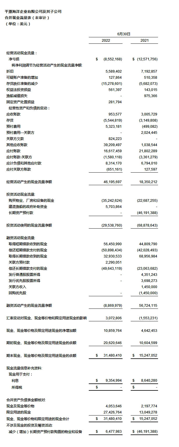 平潭海洋企业有限公司(纳斯达克:PME,"平潭海洋"、"我们"或"公司"), 是一家总部位于中华人民共和国的渔业公司。公司今日公布截至2022年6月30日的2022年上半年未审计财务报告。