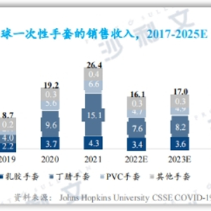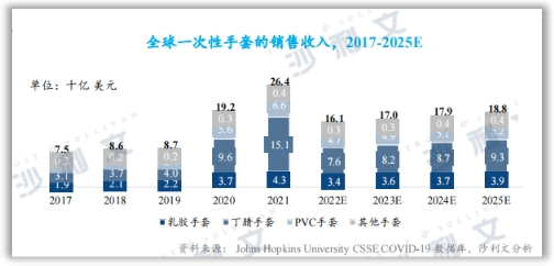 根据弗若斯特沙利文报告显示,全球一次性手套销售在2019年-2021年分别达87、192和264亿美元,销售额呈跨越式增长的态势。由于2021年至今,疫情进入中后期,市场需求逐渐稳定进入调整周期,产品平均售价下滑,2022年全球一次性手套销售额有所回落,而此后待市场调整期结束后销售收入或将步入稳定增长阶段,增速回归理性。