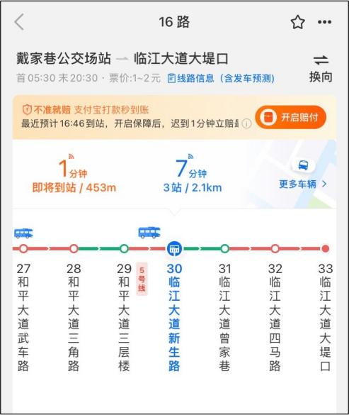 只需选择要乘坐的公交线路,即可看到在本线路上目前共有几辆车在运行、运行位置、进站时间等。通过算法实现分钟级的时间预测,更准确、更精细,用户再也不用猜公交什么时候会来。