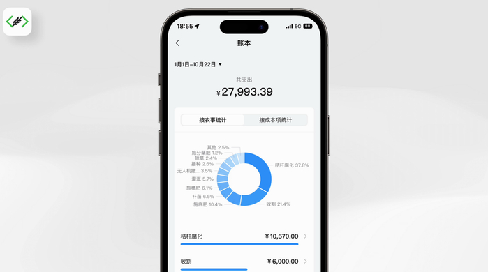 此外,农场管理还涉及方方面面的成本支出和花销,如何让每一笔钱都花到实处、用出效果,农场APP也有考虑。在极⻜农场 APP 上,农场每一笔人工开支、农机服务费、种药肥等生产资料的购买都能快捷、规范地被记录和保存,并进行成本分析,让农场主把每一分钱都花得清楚、花得明白,实现精细化管理。