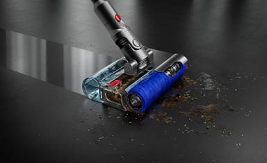 戴森建议拖地前先干式除尘,而V12 Detect Slim Nautik的纤巧软绒滚筒采用碳纤维材质,因为碳纤维材质本身自带静电反应,可以有效从地面吸除最细小的微尘。吸尘后再进行湿式清洁,跟传统拖地相比能更加高效地清洁地面。