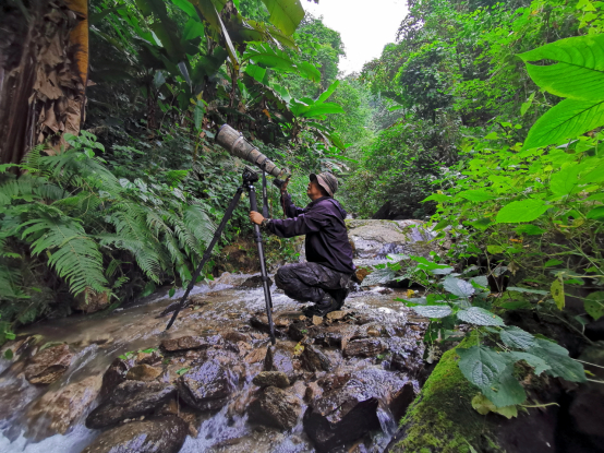 蝉噪林逾静,鸟鸣山更幽。对于多年以来专注于自然生态摄影的我来说,没有什么比佳能EOS R5和RF100-500m F4.5-7.1 L IS USM这个全能组合,更适合行摄于盈江这黝暗深邃的亚热带雨林中了。这个组合加起来不过2108g,功能和焦段都堪称全能,在雨林中操控顺手,穿梭轻松自如,长时间手持端拍也毫无费劲之感。