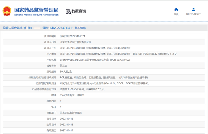 近日,北京艾克伦医疗科技有限公司旗下新产品—Septin9/SDC2/BCAT1基因甲基化检测试剂盒(PCR-荧光探针法),经国家药品监督管理局审批,获得国家药品监督管理局(NMPA)三类医疗器械注册证,医疗器械注册证号:国械注准20223401371。