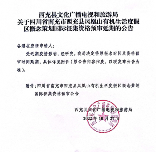 关于四川省南充市西充县凤凰山有机生活度假区概念策划国际征集资格预审延期的公告