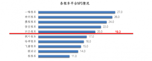 调研结果显示,参加调研的10 家租车平台平均 NPS 口碑净推荐值为 19.2。其中,一嗨租车以NPS净推荐值27.0位居行业第一,其次是神州租车,为 26.0;排名第三的是携程租车,为 24.0。