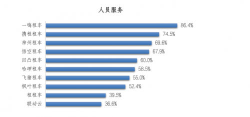 其次,61.0%的受访者在推荐原因中选择“人员服务”。一嗨租车被推荐原因占比最高为 86.4%;其次是携程租车和神州租车,分别为 74.5%和 69.6%。受访者认为送、取车人员服务态度好,守时,专业是他们考量的标准。