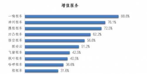 同时,56.9%的受访者在推荐原因中选择“增值服务”。一嗨租车的推荐者选择该原因的比例最高,为 88.6%;其次是神州租车,为 76.1%;第三的是携程租车,为 72.5%。儿童安全座椅、紧急救援服务、不计免赔服务、GPS导航服务是衡量的标准。