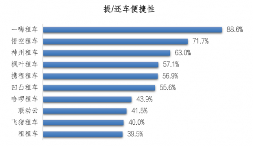 最后,56.7%的受访者在推荐原因中选择“提/还车便捷性”方面。一嗨租车的推荐者选择该原因的比例最高,为 88.6%;其次是悟空租车,为 71.7%;第三是神州租车,为63.0%。一嗨租车全国500多座城市的1万多个直营网点,提供异地/同城异店还车服务让消费者无后顾之忧。