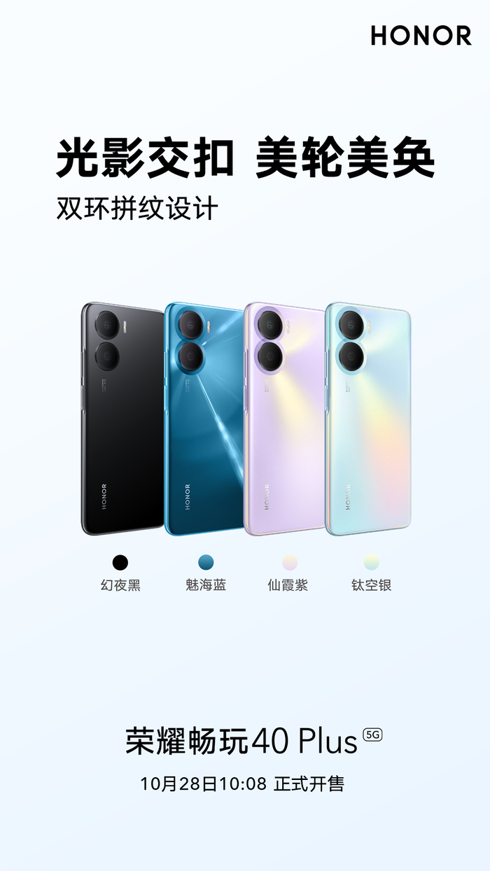 10月28日10点08分,荣耀畅玩系列全新力作荣耀畅玩40 Plus在荣耀商城、荣耀亲选商城和各大授权电商平台正式开售!作为一款高品质5G入门手机,荣耀畅玩40 Plus全系标配6000mAh大电池、5000万像素的超清后置主摄,最高支持8+256GB超大存储。在续航、影像、内存以及综合体验上全面提升,为用户带来全新跃级选择。