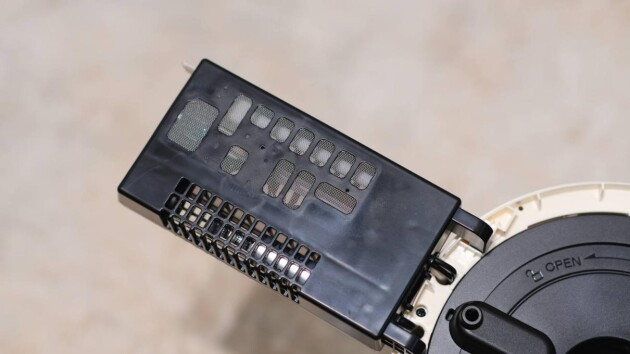 取出湿帘后,可以看到 PTC 陶瓷加热网,加热网与主机外壁之间还有一个 H13 级别的 HEPA 滤芯,这个滤芯过滤效率可达 99.97%,能够有效的过滤掉空气中的病毒、细菌、真菌等微生物污染物,防止水质污染,保证空气清洁。