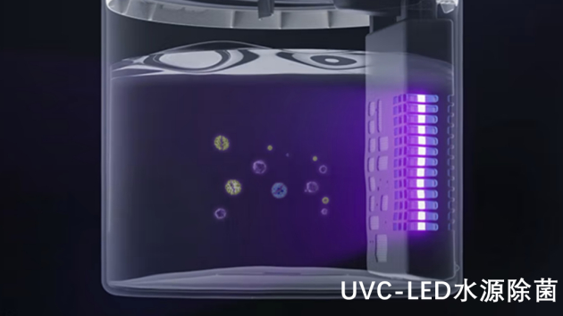插入水中的模块内部集成了 UVC-LED 水源除菌模块。每次加水后,会进行 20 分钟高效紫外杀菌,菌率可以达到 99.99%,保证水源洁净。