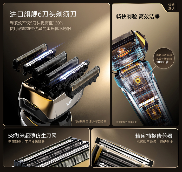 作为此次新品中的旗舰型号,IZUMI V9系列中的V991C-N,V951C-H配备了立体浮动6刀头,剃须面积更大更舒适。搭配强劲马达驱动,每分钟约10000转,疾速切割约60000次*1,剃须效率更高。