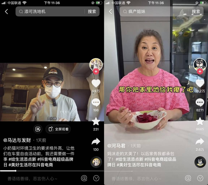 抖音头部剧情搞笑达人【河马君】爆笑演绎与妈沫儿互怼日常,萌宠类达人【马达与发财】为小奶猫全面除菌消毒,两位头部达人使用芙万3.0和芙万2.0洗地机加入家务接力,将影响力覆盖到潜在受众人群,也通过评论区置顶link的形式为抖音添可官方旗舰店引流。