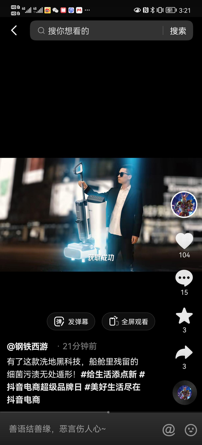 值得一提的是,特效类达人“钢铁西游”通过酷炫的场景特效,展示了新品【芙万station空间站吸拖洗一体机 】智能、便捷的产品特点和所传达的空间站场景氛围。达人运用特效融入了真实的空间站内容,使视频内容与产品名称巧妙衔接,为视频和添可新品都赋予了满满科技感,加入到超级种草团中,实现了3D大屏在线上的二次传播,在为活动提升曝光量的同时也为抖音官方旗舰店引流。