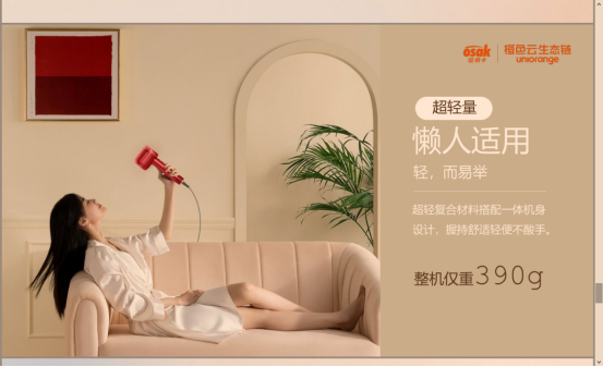 对于90后、00后来说,没有什么产品比得上懒人产品,或者说,在新时代的消费者心中,解放双手是每一个企业创造产品的关键动作,osak橙飒卡超静音高速吹风机深谙此道。所以,超轻量懒人适用,整体机身不超过390克,相当于8枚鸡蛋的重量,虽然因为产品特质无法做到真正的“解放双手”,但做到了轻而易举。这源自于超轻复合材料搭配机身一体设计,将握持轻便不酸手的宣传口号化为实处。