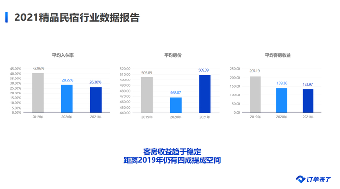 《2021精品民宿行业数据报告》表示受疫情影响,2019年至2021年全国民宿平均入住率和客房收益虽然连续三年有所下降。但好消息是2021年民宿的平均房价较2020有很大提升,甚至超出2019年均价水平,2021年订单取消率较2020年也有明显回落。