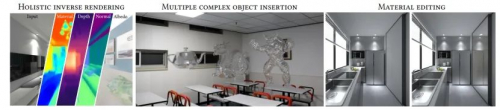 本论文提出了一种新的基于蒙特卡洛重要性采样的可微渲染网络层,来模拟室内场景的物理光线传播。同时,利用论文中的逆向渲染框架,可以将单张复杂室内场景的图片,形成三维场景,且实现可对场景中的模型和材质进行编辑。