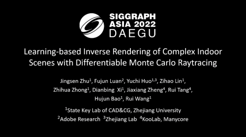 本次入选的论文由群核科技和浙江大学计算机辅助设计与图形学(CAD&CG)国家重点实验室等机构合作完成,题为《Learning-based Inverse Rendering of Complex Indoor Scenes with Differentiable Monte Carlo Raytracing》。