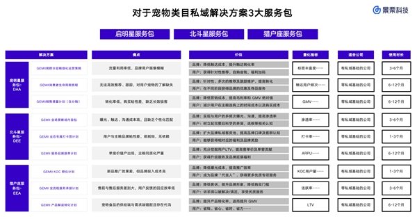 为降低品牌在匹配私域服务时的选择成本,景栗科技基于过往服务经验及宠物类目核心逻辑,提出了宠物类目私域运营专属3大服务包,给到市场中不同的生意伙伴降本增效、获取生意增量的针对性解决方案。
