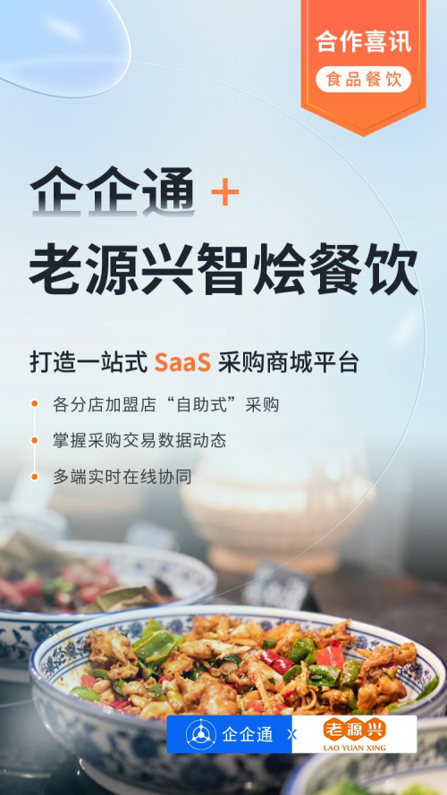 近期,苏州老源兴智烩餐饮管理有限公司(以下简称"老源兴智烩餐饮")与企企通达成合作。此次合作旨在通过数字化、智能化,帮助老源兴智烩餐饮优化采购业务,建立智能高效的采购商城平台,实现企业一站式信息化、标准化采购。