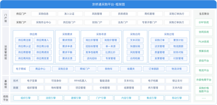 答:泛微·京桥通囊括了从供应商管理、采购需求管理到采购招投标、采购合同、采购执行等全过程数字化管理。总结下来,我们在可信数字身份、智能组件技术、低代码灵活构建应用、分级分权管控等方面颇具特色。