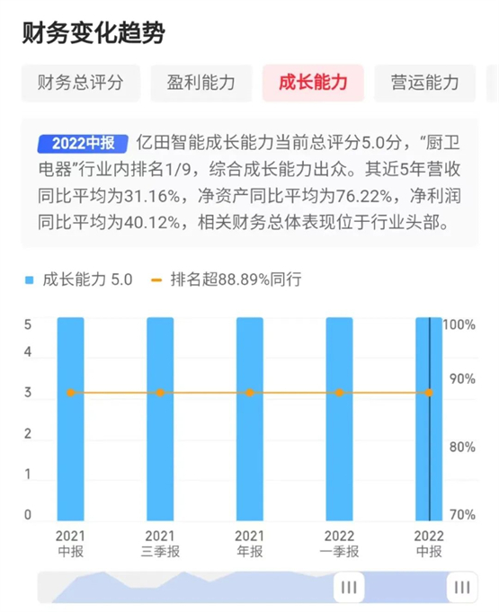 从同花顺平台可以看到,亿田智能成长能力在厨卫电器板块排名前列。其近五年营收同比平均为31.16%,净资产同比平均为76.22%,净利润同比平均为40.12%。