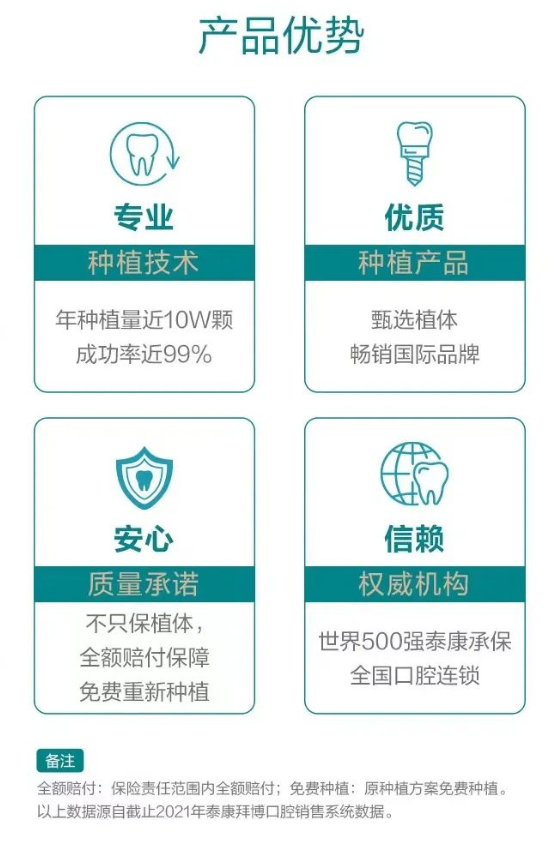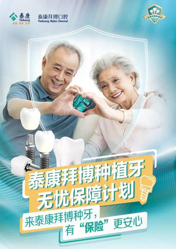“泰康种牙无忧保”由泰康拜博口腔与泰康在线联合研发、泰康拜博为种植牙客户投保、泰康在线承保的种植牙质保险,提供保险责任范围内全额赔付与原种植方案免费重新种植双重保障。
