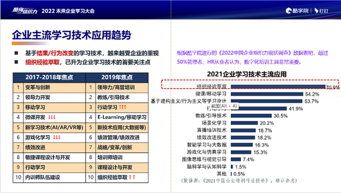 新华报业传媒集团《培训》杂志副主编顾邦友,大会上分享了其《2021中国企业培训行业报告》和来自酷学院《2022中国企业组织力现状调查》的一些关键数据。后者调研显示,超过50%管理者、HR从业者认为,数字化培训工具和技术非常重要。前者数据更精确地指出:组织经验萃取,在2021年已经成为为企业学习技术的首要关注点。