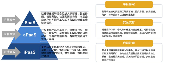 以SaaS+aPaaS+iPaaS满足企业客户在组织架构管理、用工结构管理等方面灵活定制与高效对接需求,将业务数据与人力成本联动,帮助企业动态优化用工结构,节约人力成本、提高用工人效。