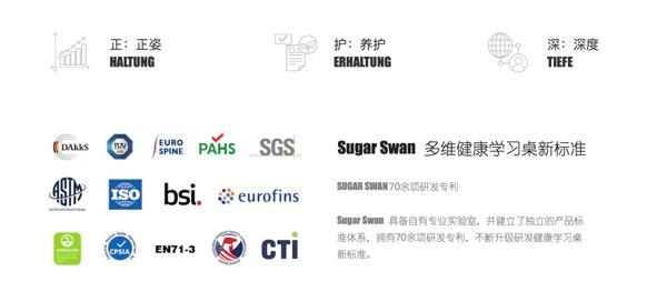 SugarSwan糖天鹅总部位于德国法兰克福,是德国的专业家具品牌,也是德国学习桌椅领域的健康专家。SugarSwan糖天鹅学习桌椅在全球40多个国家销售,拥有70余项研发专利,更是通过德国TUV、美国UL、英国BSL,以及欧洲脊柱协会等多项专业认证,屡获设计奖项。产品系列全面,覆盖大小户型的健康学习需求,“0”甲醛无异味,全系列学习桌使用加厚实木并配置美国”FORMICA”抑菌桌面,德国进口五金系统,360度防夹的设计。健康安全,厚重稳定,呵护孩子的学习健康。