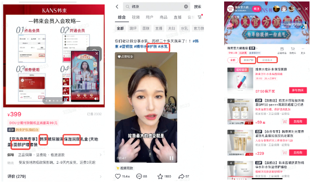 具体而言,在搜索场景,韩束在短视频/直播间/商品标题等关键位置提及行业热搜词,覆盖品牌/产品名称定向搜索、广义功效,确保用户搜索相关关键词能第一时间展现出韩束的内容,同时以短视频供给为依托,增加搜索的曝光度。在商城推荐上,一方面,确保商品链接稳定;另一方面,韩束利用直播间人群积累,增加双场景的互动。在店铺流量维度,韩束通过提升商品详情页品质吸引用户关注,在设计上,店铺装修优化;在文案表述上,以利益点及主推商品前置的方式,吸引用户下单。活动期,通过专项优化,韩束抖音商城GMV增加了超过43.89%。