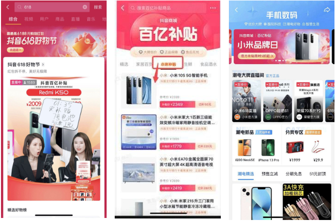 在抖音618好物节中,小米抓住全品类、强认知的品牌属性,联动抖音商城百亿补贴,充分发挥了内容和货架运营优势,在抖音商城实现迅速爆发。值得一提的是,小米前期布局商城+直播间链路测款,令品牌爆发得以落地。