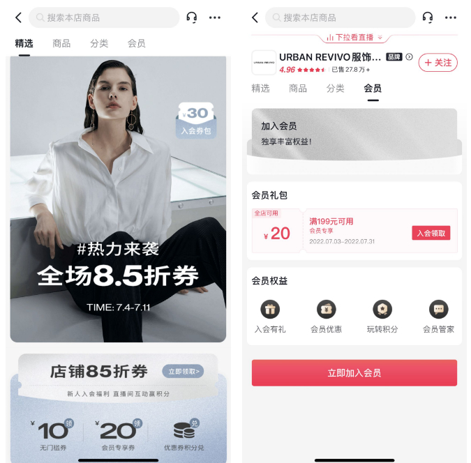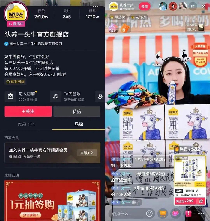 服饰领域的UR、食品饮料行业的认养一头牛就是其中的代表。在拉新阶段上,认养一头牛通过低价套装吸引用户回购,在品牌账号主页置顶“加入会员”入口,并在直播间进行会员贴片配置,引导新会员入会。