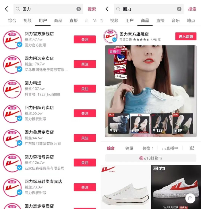 此后,明确了「号」的定位,在「号」的内容与「店」联动、在货盘上深耕。如,@回力户外 专卖店,男性用户在账号性别占比超过九成,舒适、性价比符合账号偏好。品牌在这一账号下的内容输出多以鞋品的直接展示为主,简洁明了。而@回力鲁尼专卖店 的用户画像则以女性用户为主,其中超过一半的用户是Z世代和小镇青年,对潮流感需求更高。品牌在这一账号下的内容除了鞋品展示,还有主播的亲身解说展示,增加鞋品的视觉感受。基于不同店铺的用户特征,回力品牌能在对人群做侧重性渗透的同时,依托矩阵号扩大流量漏斗,不断上探人群与GMV天花板。目前,回力矩阵号已经做到了单月度总GMV破亿的成绩。